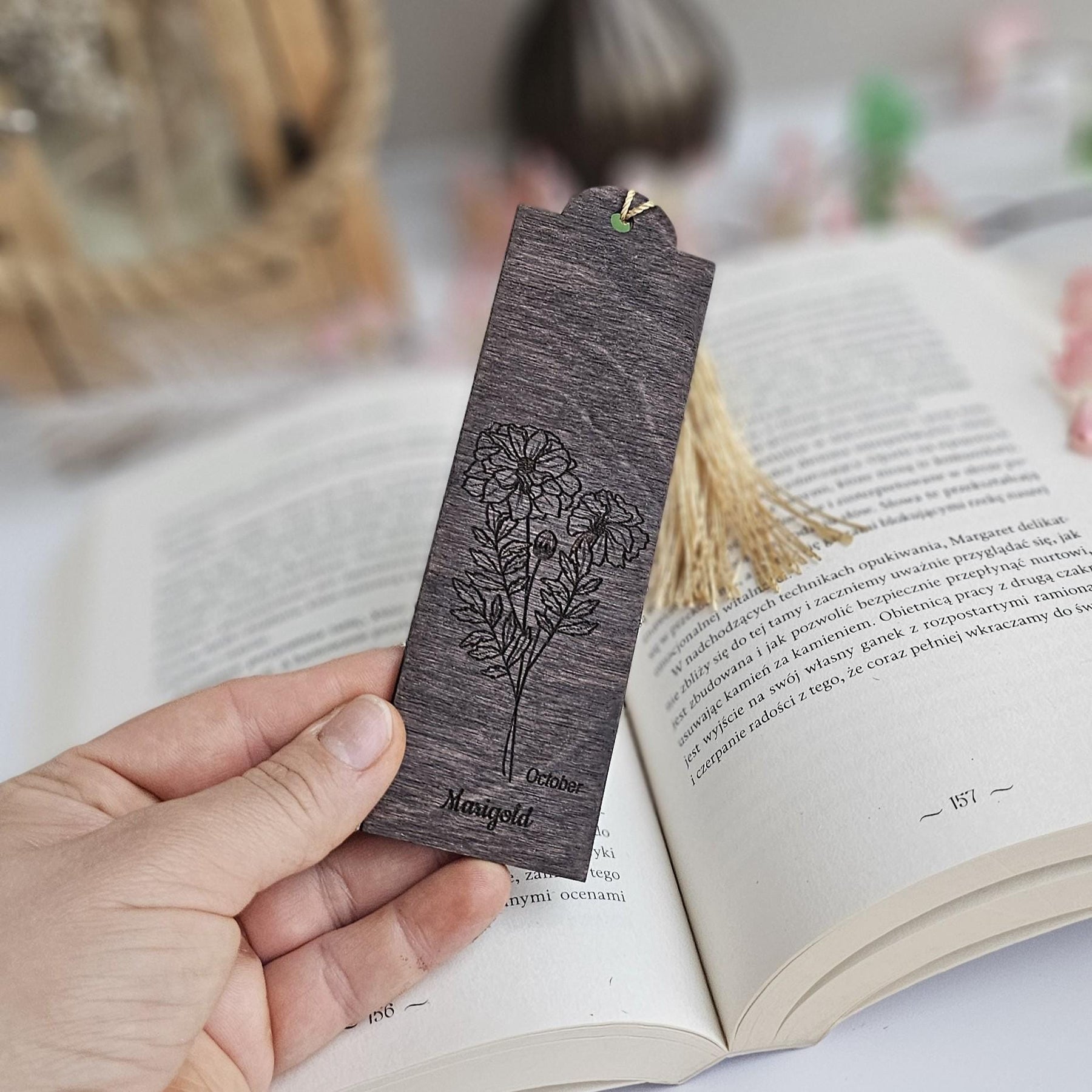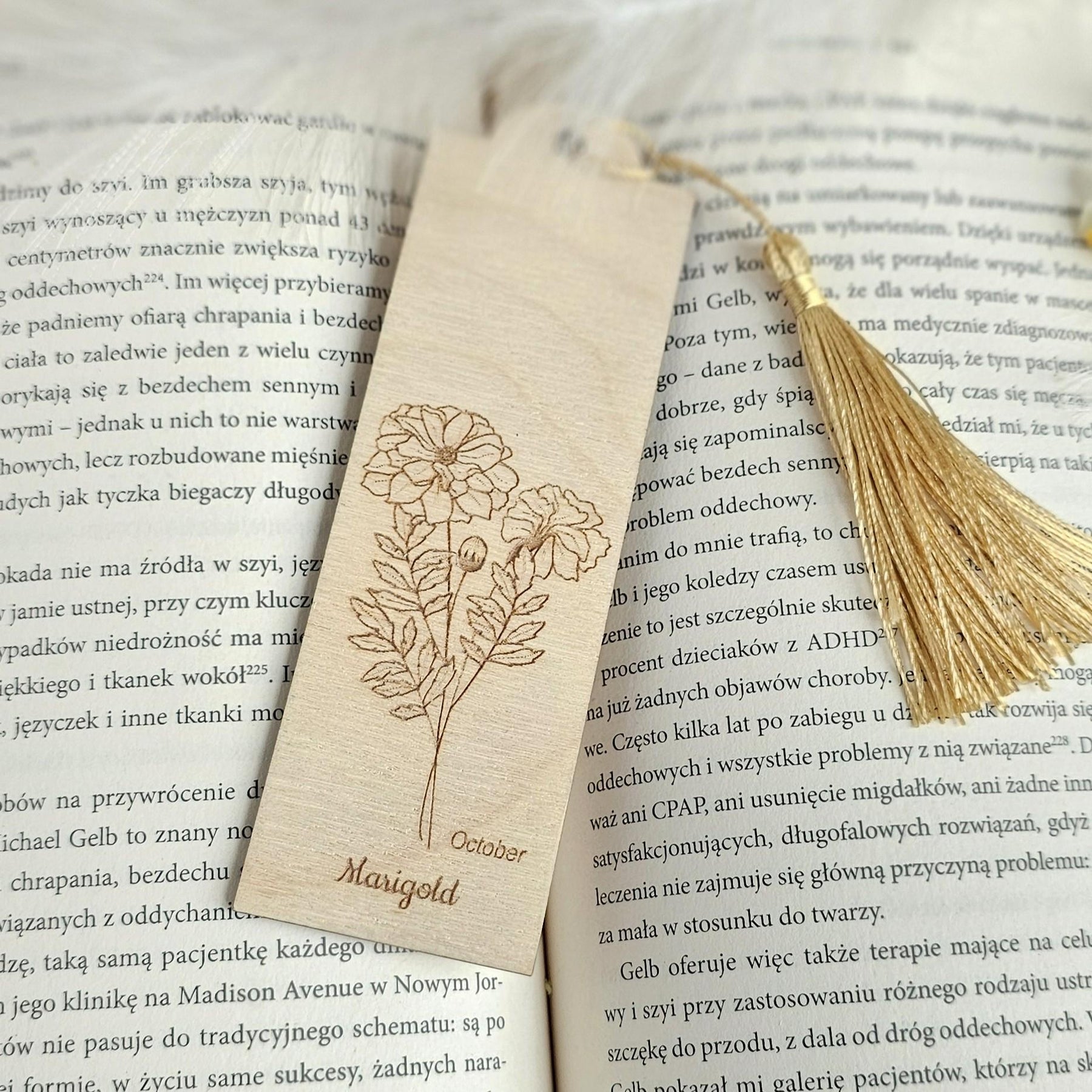 Birth Flower Bookmark October Marigold - Personalised Wooden Gift for Book Lovers