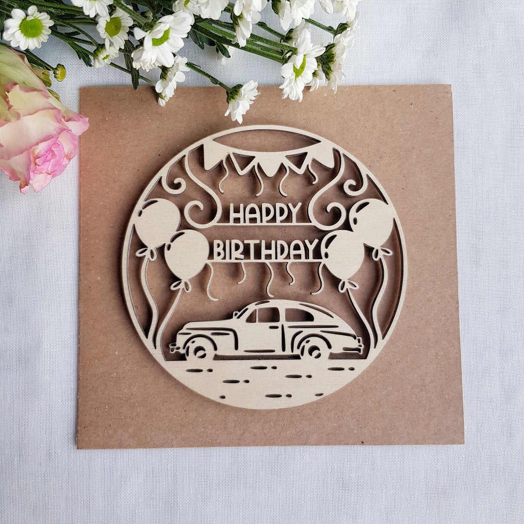 Vintage Car Wooden Card – Handcrafted Rustic Birthday Greetings for Classic Car Fans