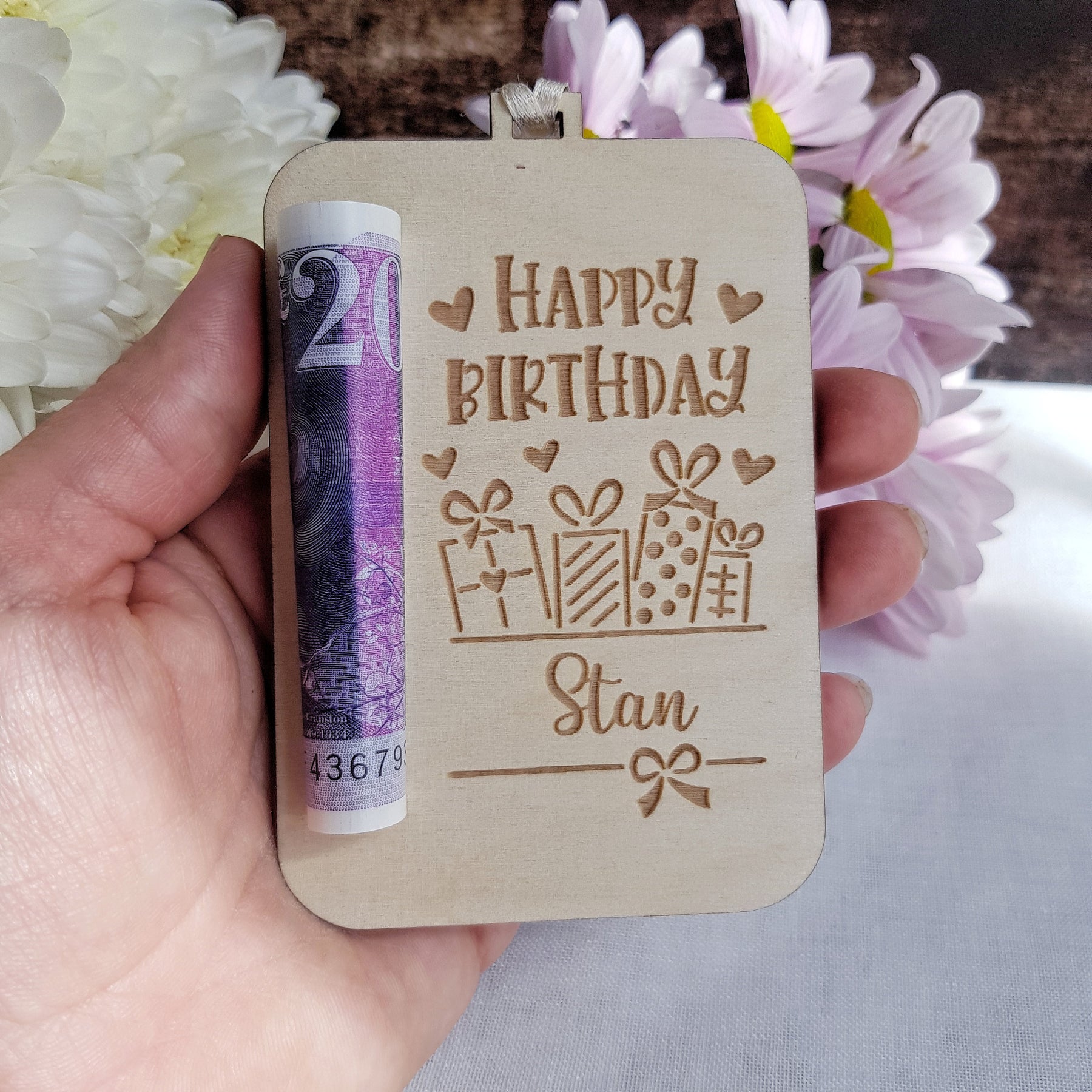 Surprise your loved ones with a unique and thoughtful gift - our personalised money gift holder! This creative and functional gift is perfect for birthdays, allowing you to give the gift of cash or a gift card stylishly and memorably. Crafted with care, our money gift holder features a sleek design with ample space to securely hold money or a gift card. Whether you're celebrating a milestone birthday or simply want to make someone's day extra special, our personalised money gift holder is sure to impress.
