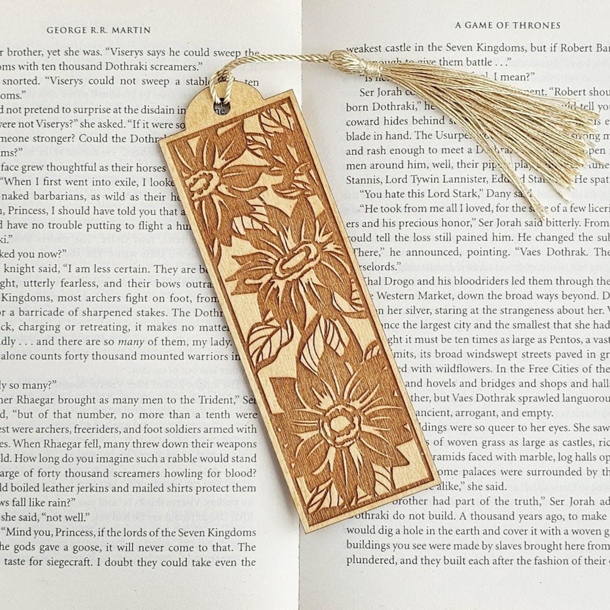 Wooden Sunflower Bookmark - Personalised Laser Engraved Gift with Golden Tassel