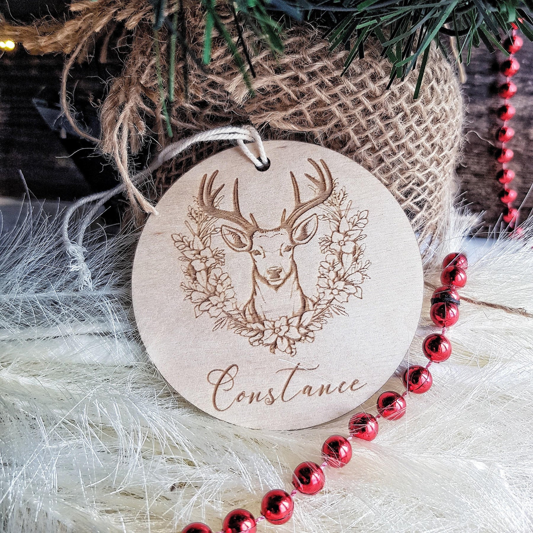 Custom Floral Wreath Deer Wooden Christmas Ornament - Personalized Festive Decoration