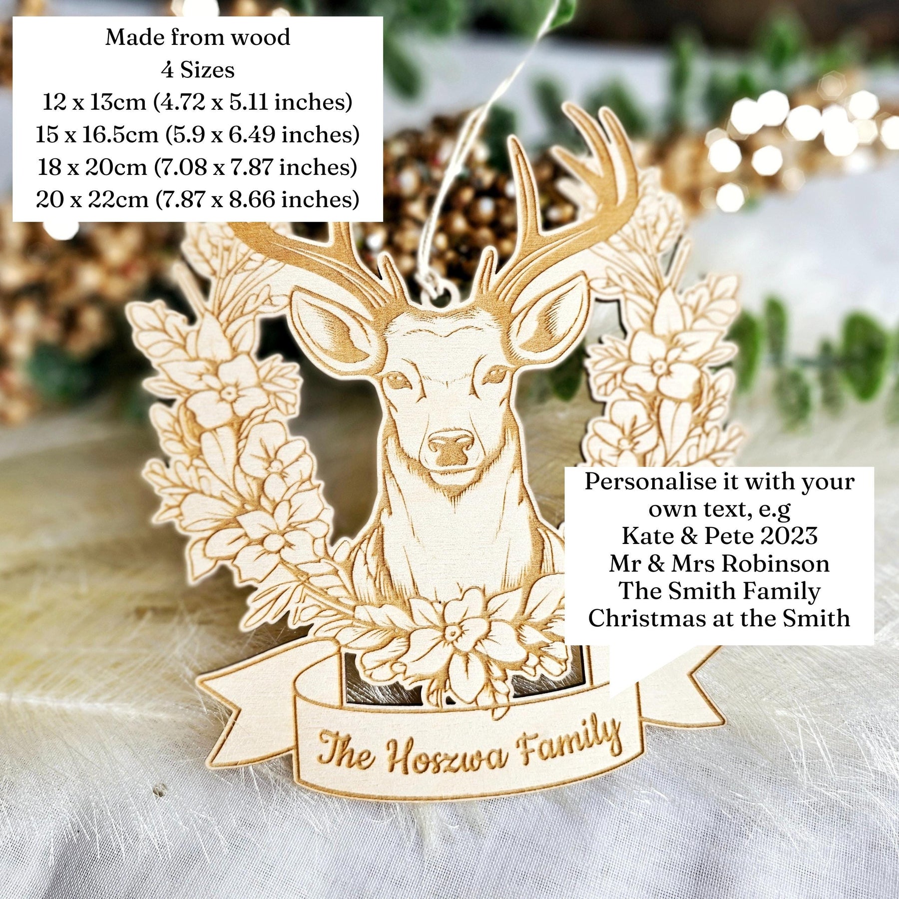 Personalised Wooden Christmas Tree or Wall Family Ornament featuring a graceful Deer Head in Flowers. Crafted with precision from high-quality plywood, each ornament captures the essence of the season through its intricate design. The striking deer head adorned with delicate flowers adds a touch of elegance and whimsy to any space, making it a perfect addition to your festive ambience.