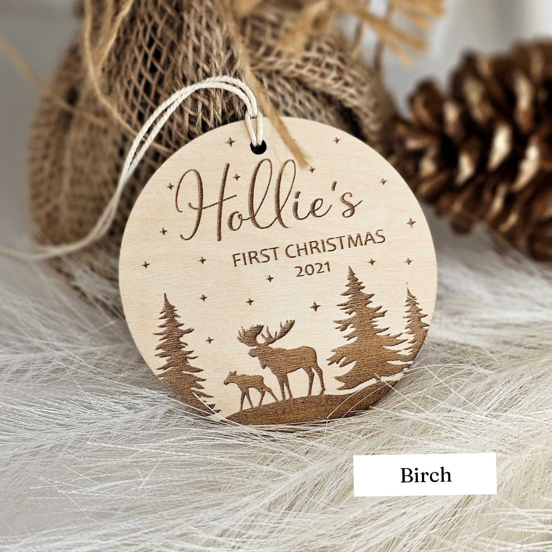 Baby First Christmas Bauble | Custom Round Wooden Ornament with Rustic Winter Forest Moose