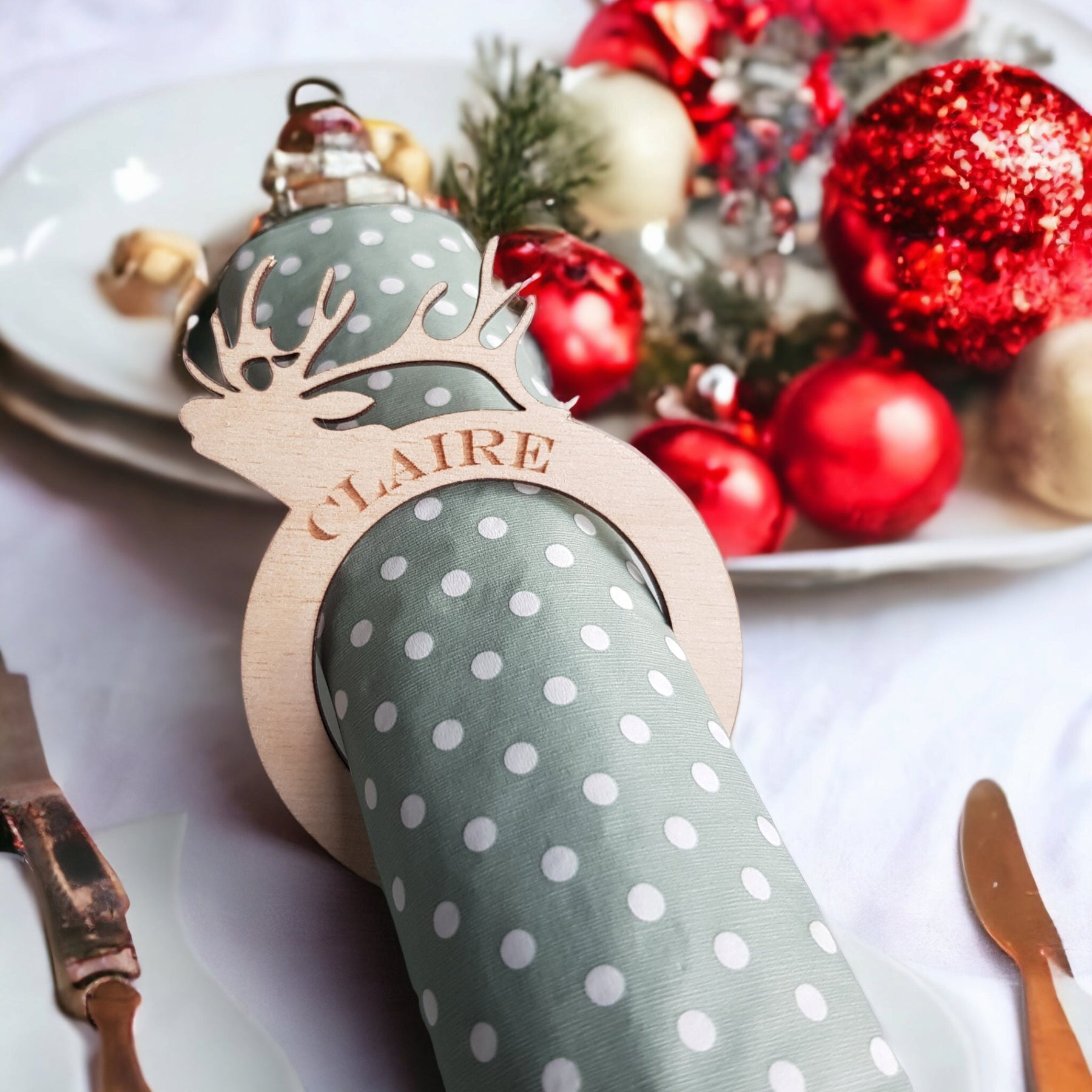 Christmas Personalised Rustic Deer Wooden Napkin Rings – the perfect addition to your holiday table decor. This charming Christmas Deer Table Decoration doubles as a Winter or Christmas wedding place setting, making your festivities even more special. Crafted with precision through laser cutting and engraving, each napkin ring is a unique blend of rustic charm and personalized elegance.