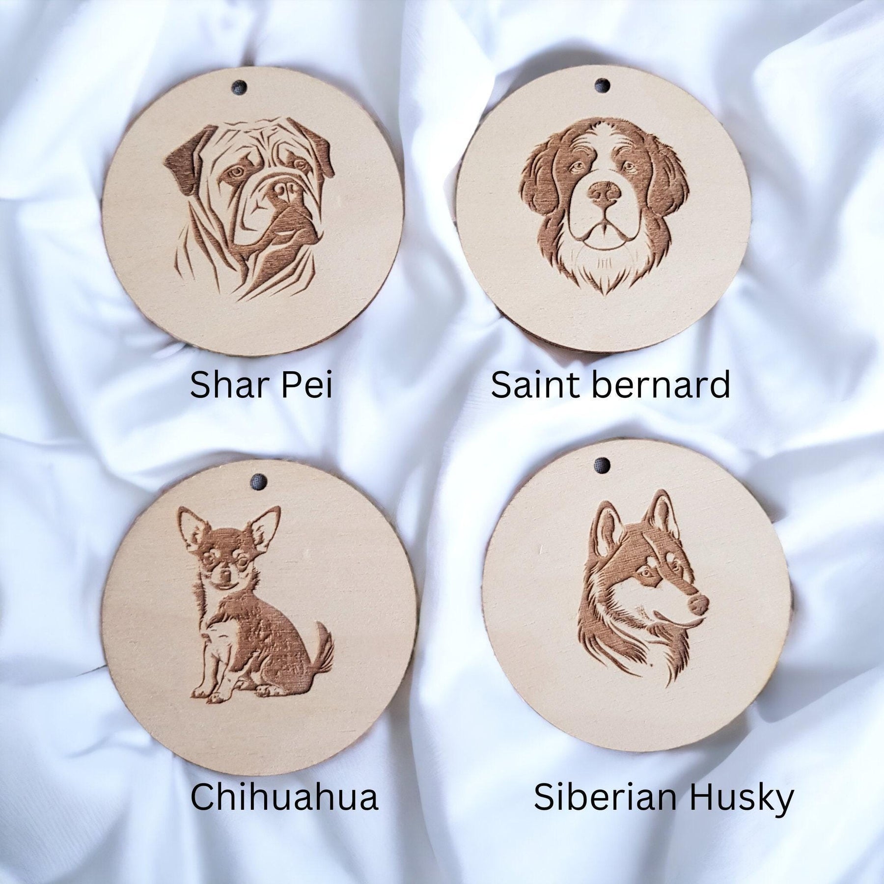 Personalised Dog Christmas Pet Decoration wooden bauble! This adorable keepsake is the perfect gift for any dog lover. Handcrafted from high-quality plywood, each bauble is carefully engraved with the breed name or short text of your choice, making it a truly special and unique ornament for your Christmas tree. Whether you have a Shar Pei, Saint Bernard, Chihuahua, Siberian Husky, Great Dane, Beagle, Bulldog, Bischon Frise, Dalmatian, Labrador Retriever, Boxer, Shih Tzu, Golden Retriever, German Shepherd, Maltese, Border collie, Dachshund, Poodle, Yorkshire Terrier, or Rottweiler, we've got you covered! Add a personal touch to your holiday decor with this charming dog bauble. It's the perfect way to celebrate your furry friend this Christmas season.