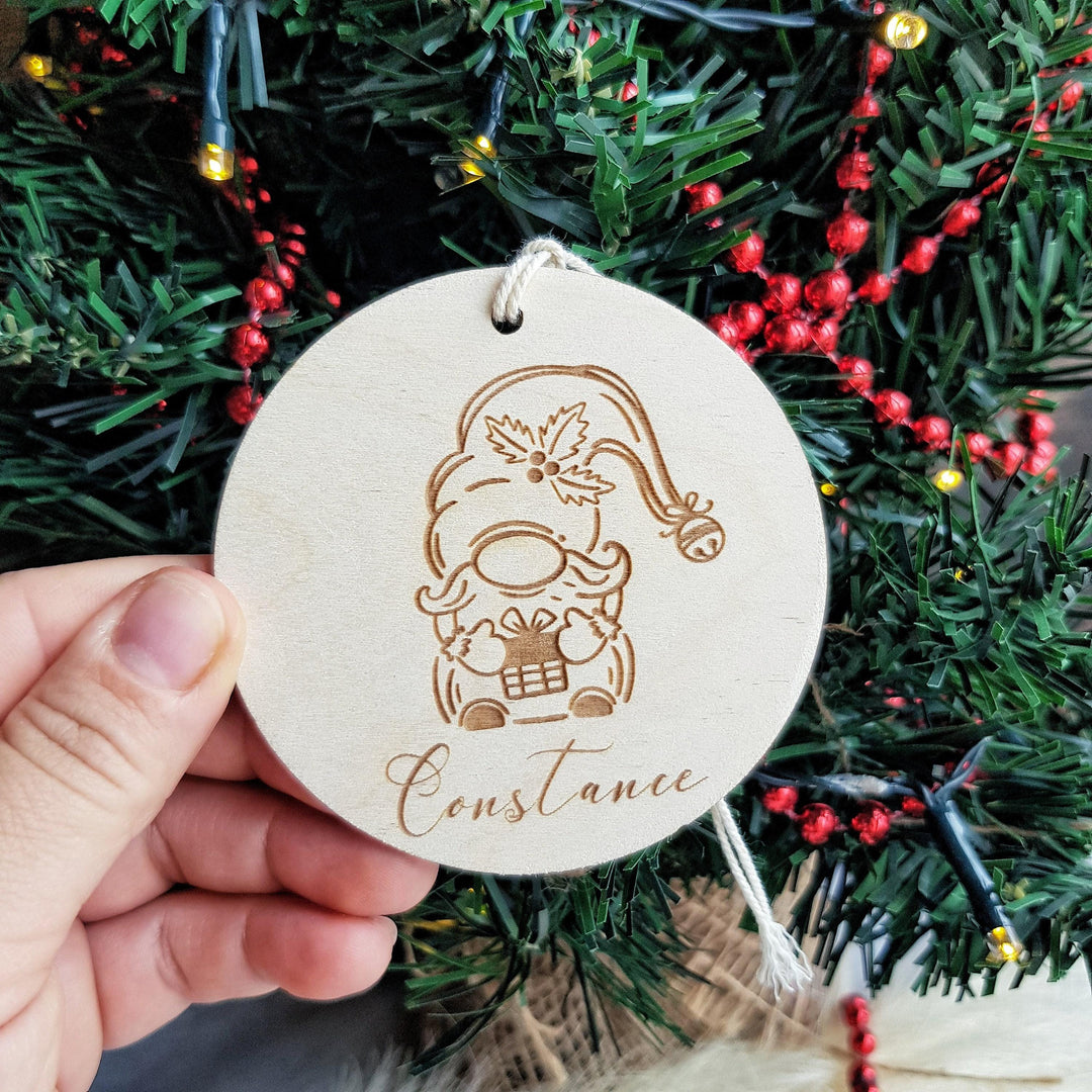 Personalised Babys First Christmas Bauble - Round Wooden Gnome Ornament Rustic Custom Keepsake