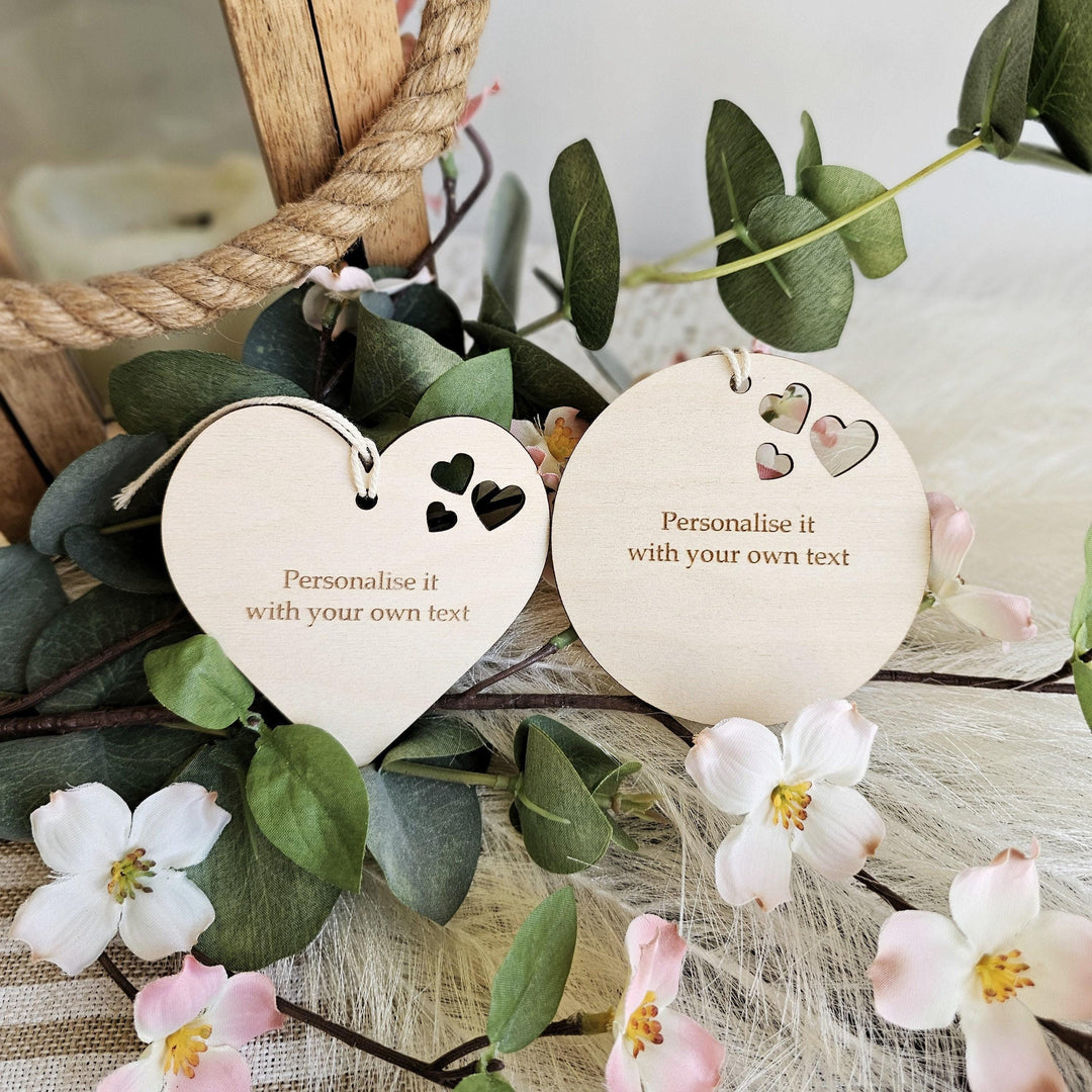 Personalised Wooden Gift Tag - Heart Round Wine Bottle Decoration Wedding Keepsake Car Mirror Charm