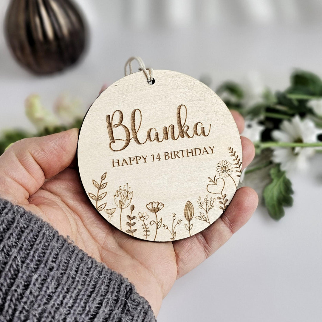 Wooden Birthday Gift Tag Floral Meadow, Personalised Keepsake, Hanging decoration, Rustic Ornament