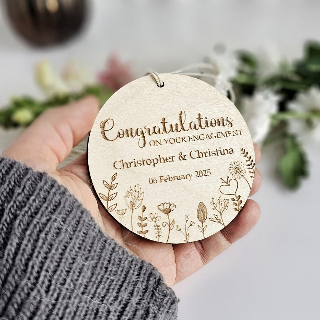 Wooden Engagement Ornament Floral Meadow, Personalised Keepsake, Hanging decoration
