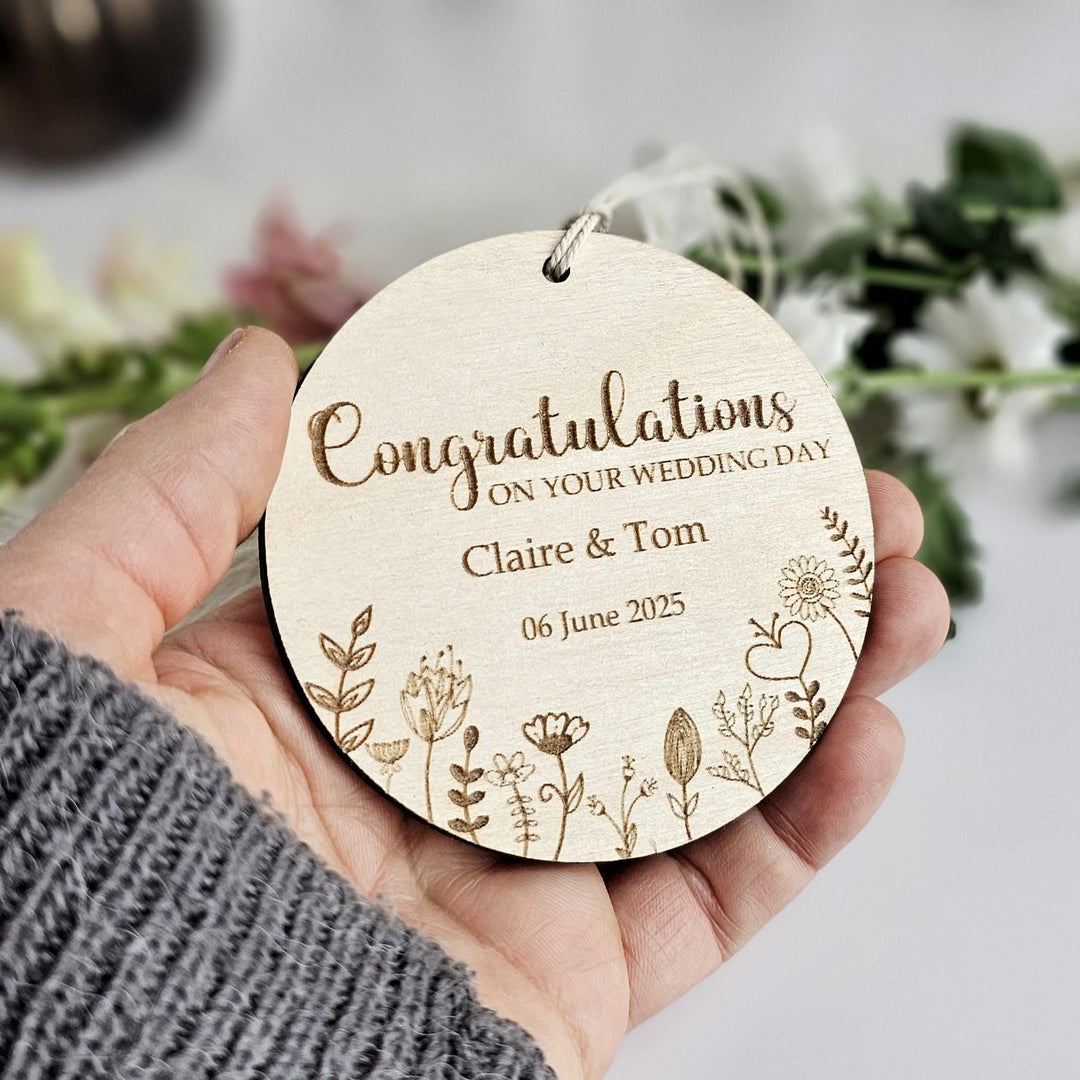 Wooden Wedding Ornament Floral Meadow, Personalised Keepsake, Hanging decoration