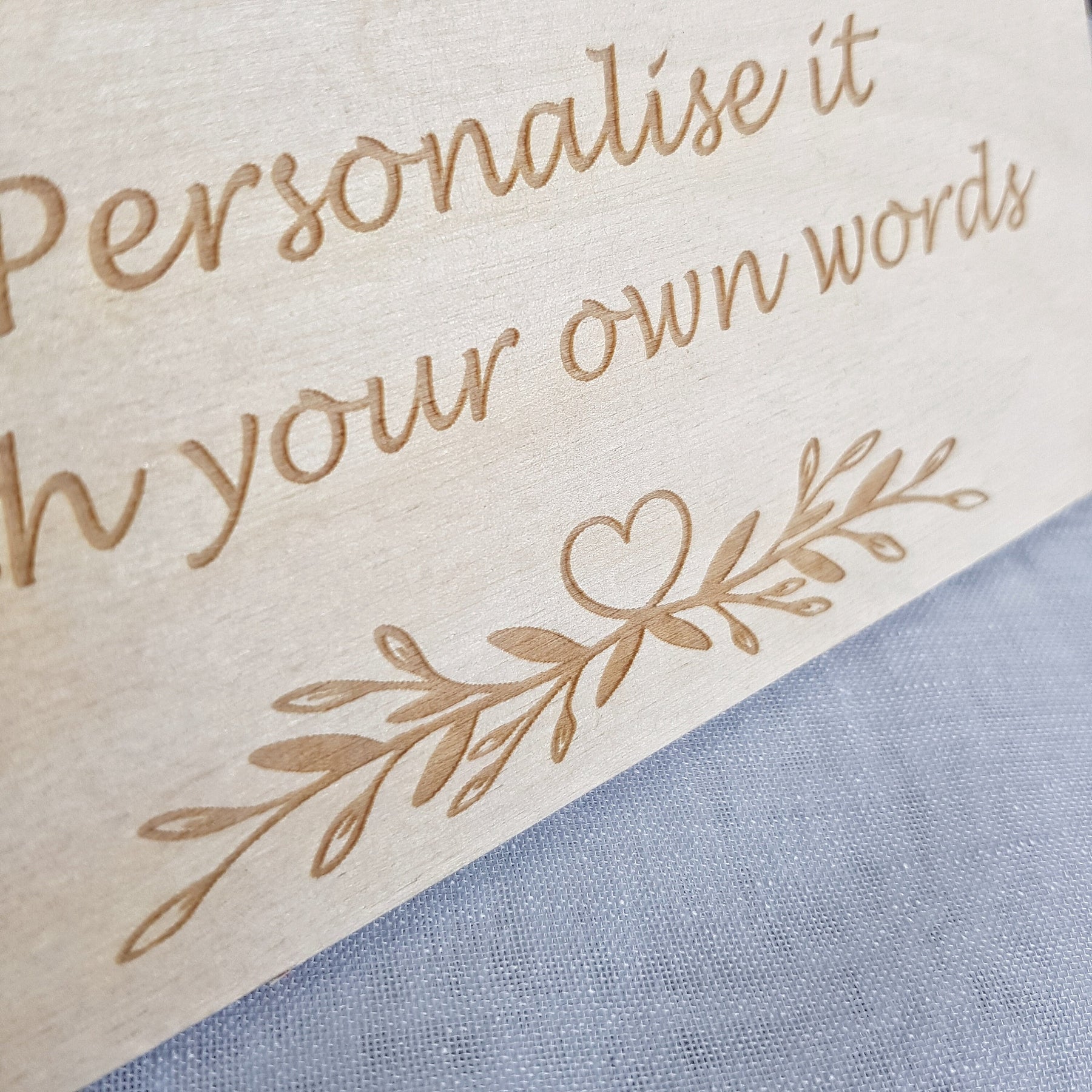 Personalised Rustic Wooden Plaque with your wording! Each sign is carefully crafted and handmade to feature stunning leaves and a heart design that is laser-engraved onto the wood. With 3 sizes to choose from, this plaque is perfect for adding a touch of charm to any space. Whether it's for your bedroom door, office, nursery, or wall, this sign will make a beautiful statement piece in your home décor. The rustic feel of the wood adds a unique touch to your interior design and can be personalised to showcase your name or any other special words of your choice. This custom plaque is a perfect gift idea for housewarming, anniversaries, weddings, birthdays, for your own space, or any other special occasion. Brighten up any room in your home with a touch of beautiful, rustic charm.
