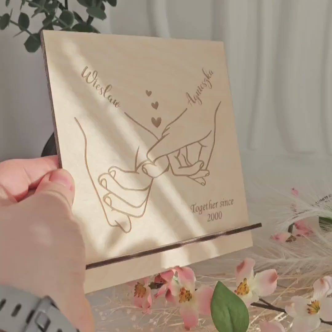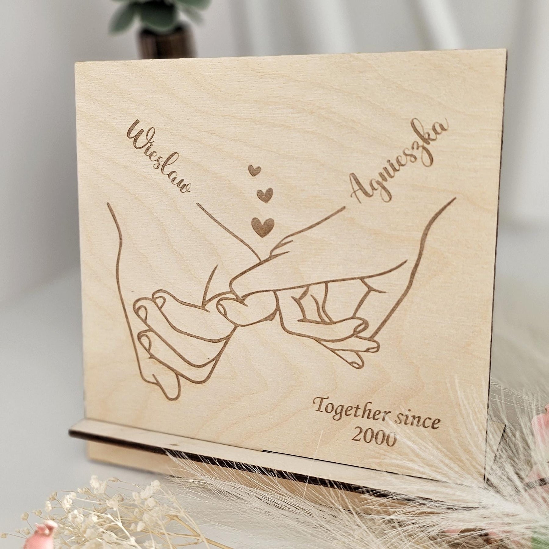 Celebrate love with this personalised wooden standing card, featuring a minimalist line drawing of a couple holding hands. This unique keepsake is handcrafted from eco-friendly wood and is the perfect gift for Valentine's Day, anniversaries, weddings, or just because.