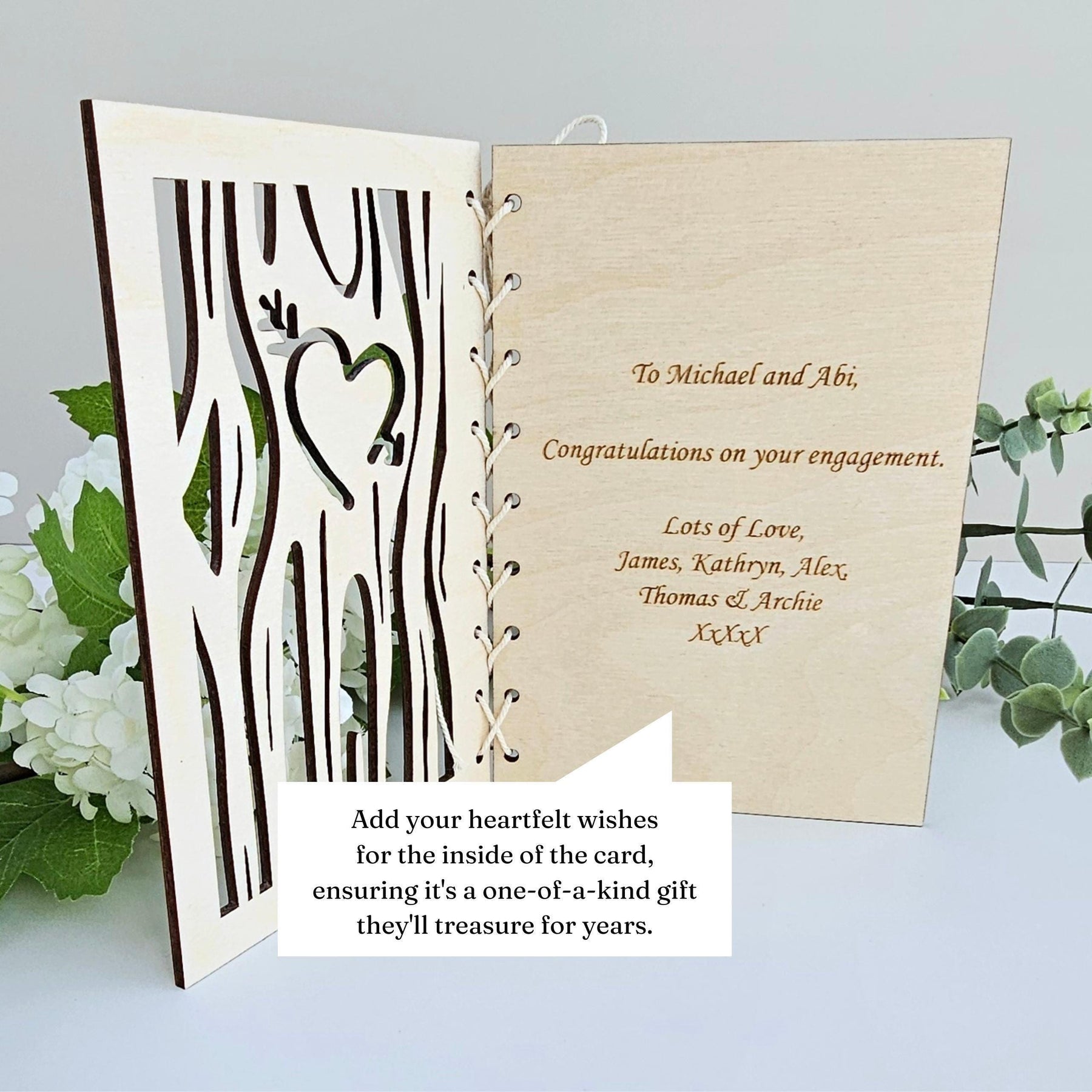 Express your love in a truly unique way with our Personalised Wooden Love Card, a heartfelt gift adorned with charming cut-out trees. Whether you're celebrating your husband, wife, girlfriend, boyfriend, or a cherished loved one, this card is the perfect gesture of affection. Not only ideal for Valentine's Day, but it also makes a fantastic choice for birthday gifts and anniversaries, engagement, or wedding cards, thanks to its versatile personalisation options.