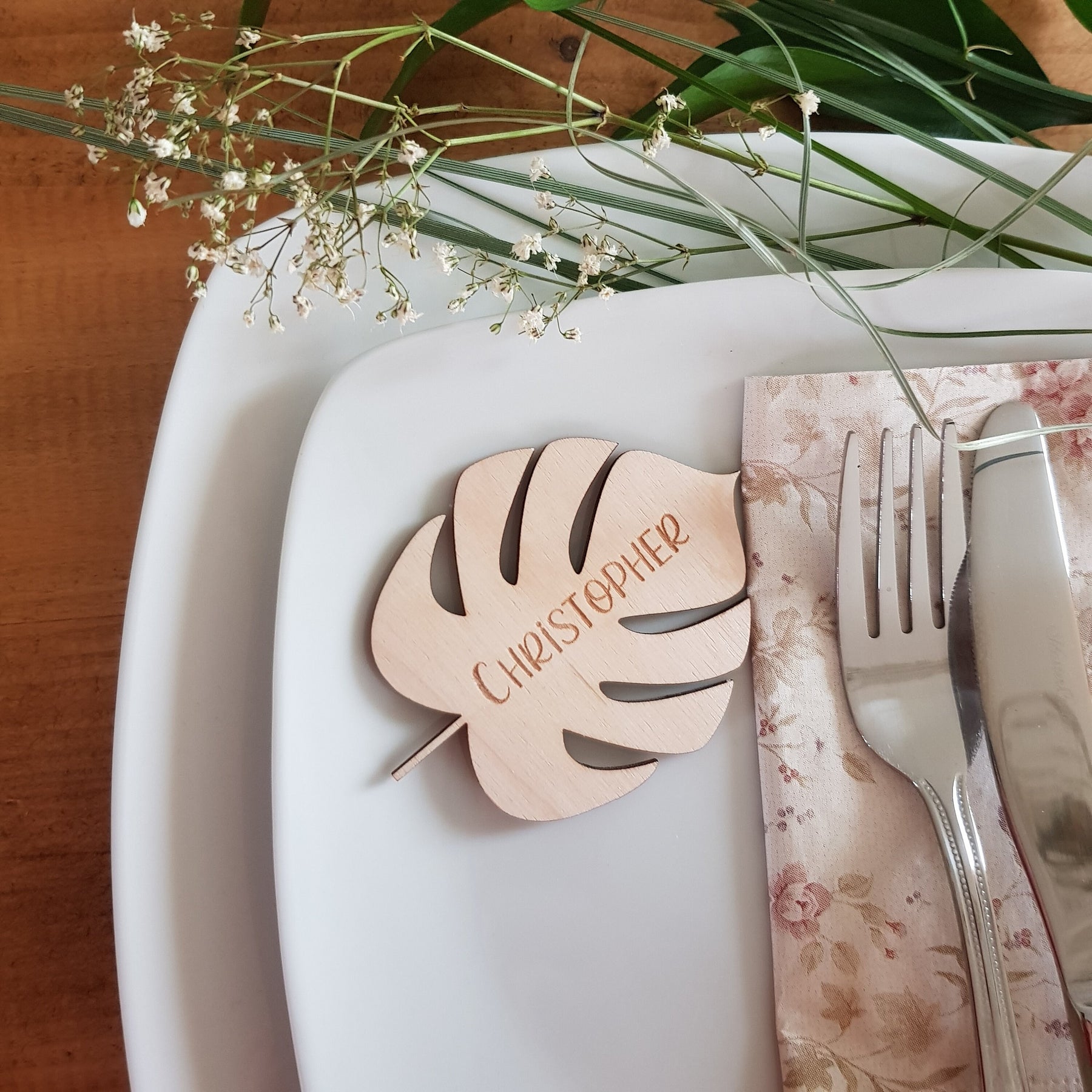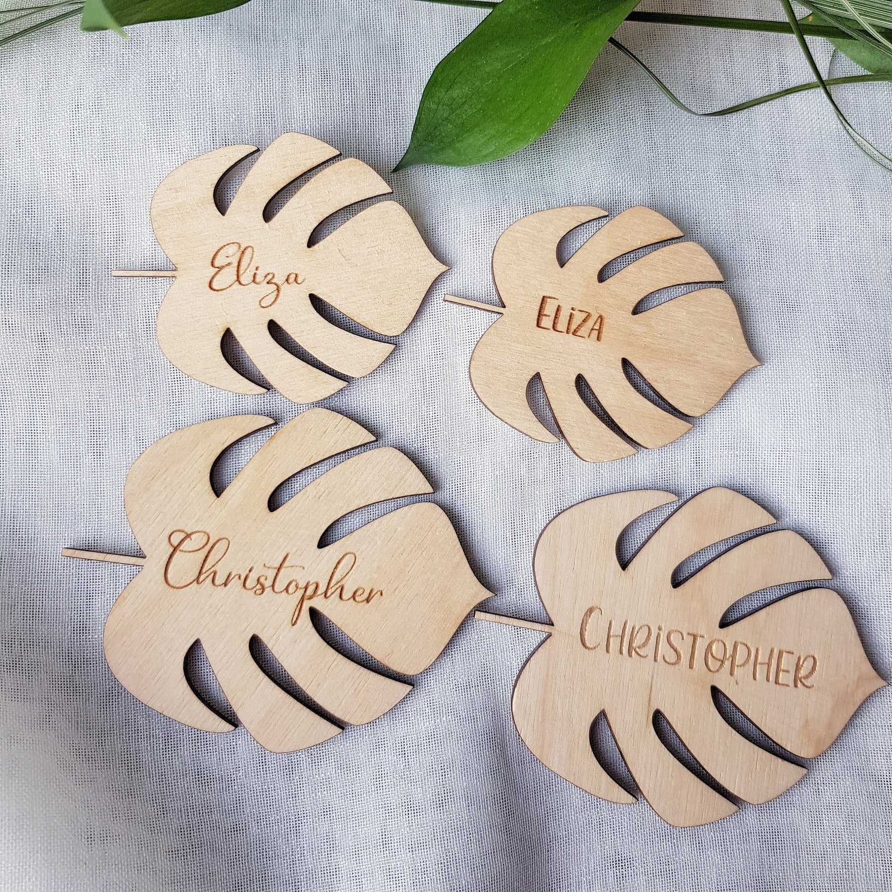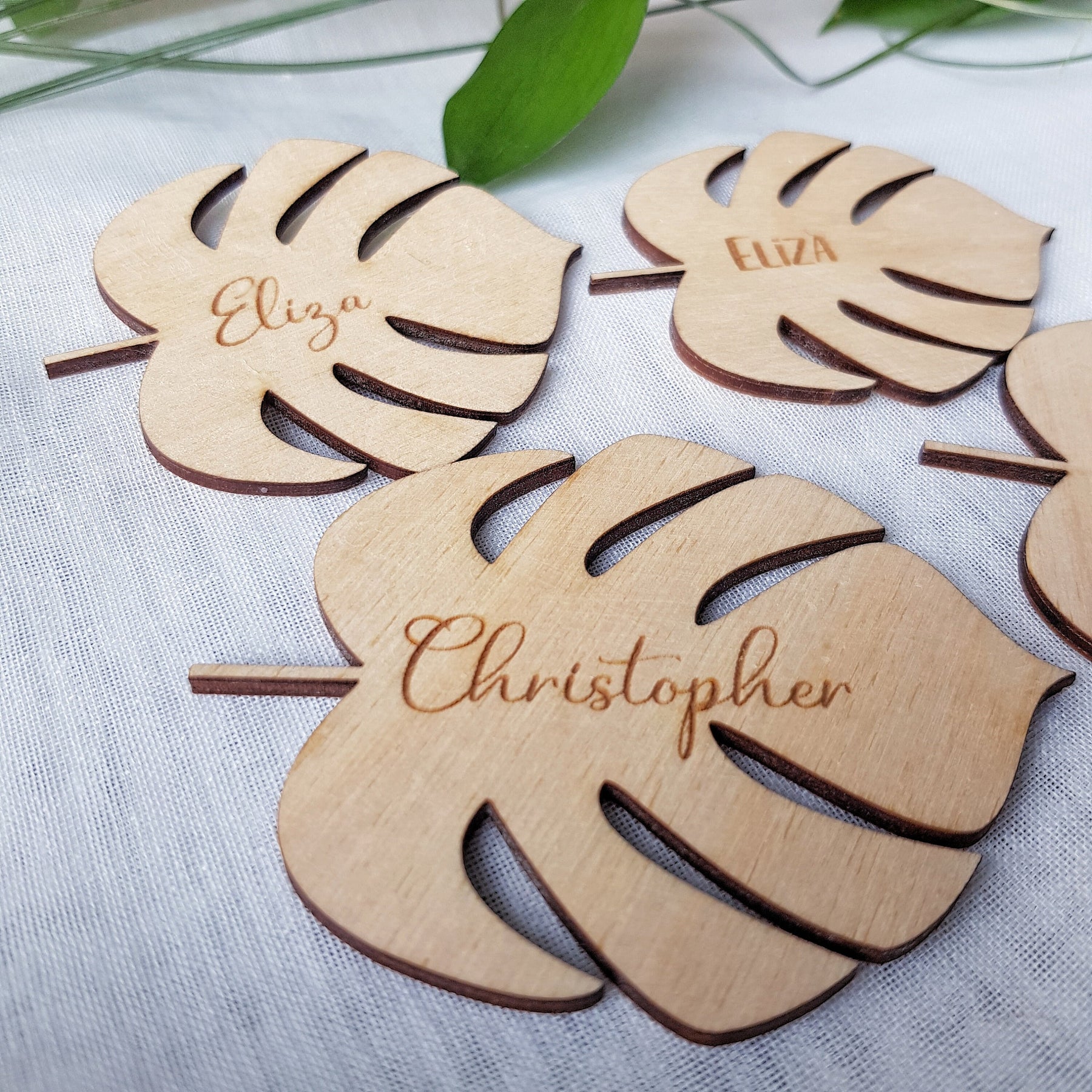 Wooden Monstera Leaf Place Name Setting are the perfect personalized touch to elevate your table decorations for weddings, Thanksgiving feasts, birthday parties, anniversaries, and any special gathering with family and friends. Crafted with care, each wooden name place is beautifully engraved with your chosen name, adding an elegant and rustic charm to your event. These unique and customizable place settings not only add a lovely visual element to your table but also serve as meaningful keepsakes for your guests to cherish. Make every occasion memorable with our Wooden Monstera Leaf Place Name Setting.