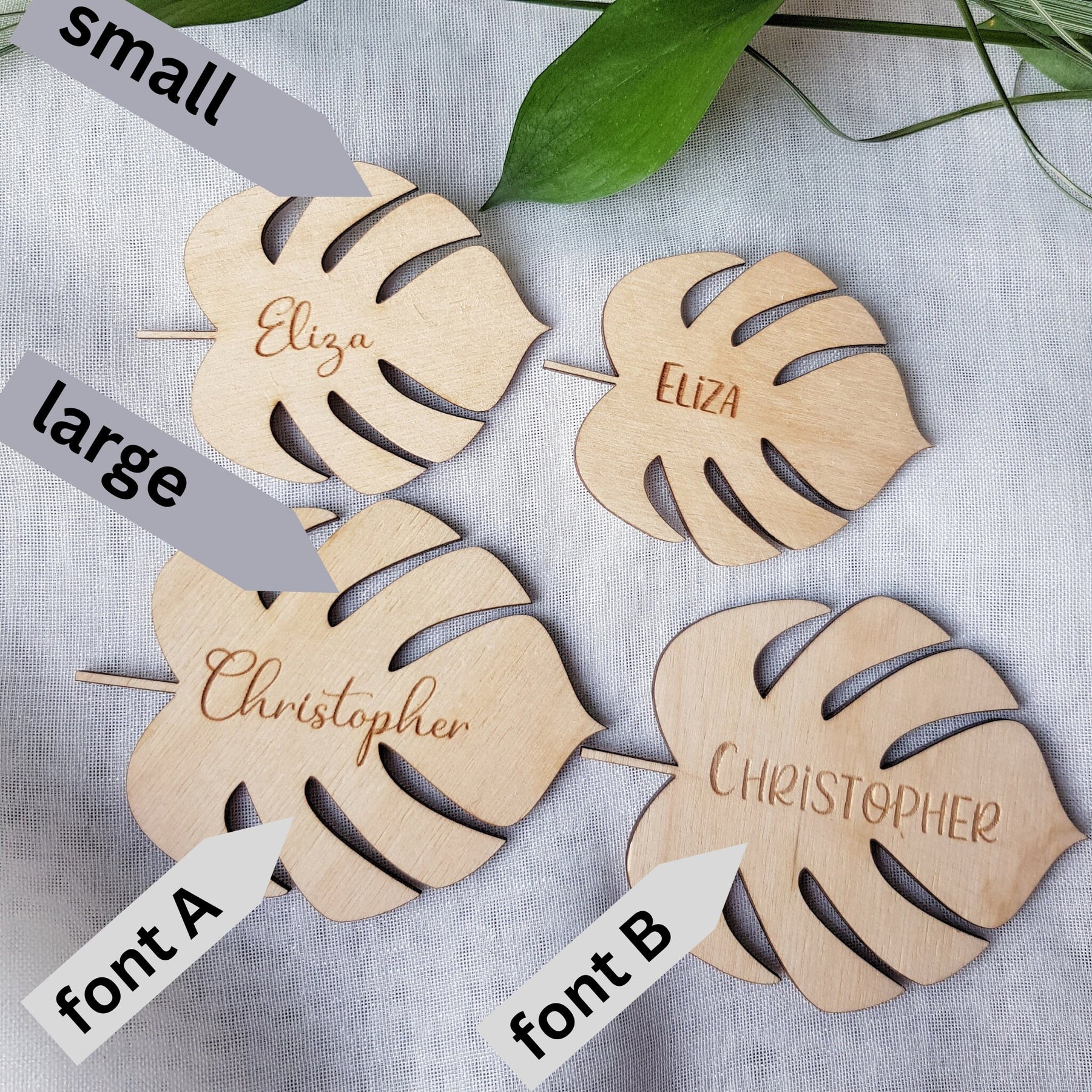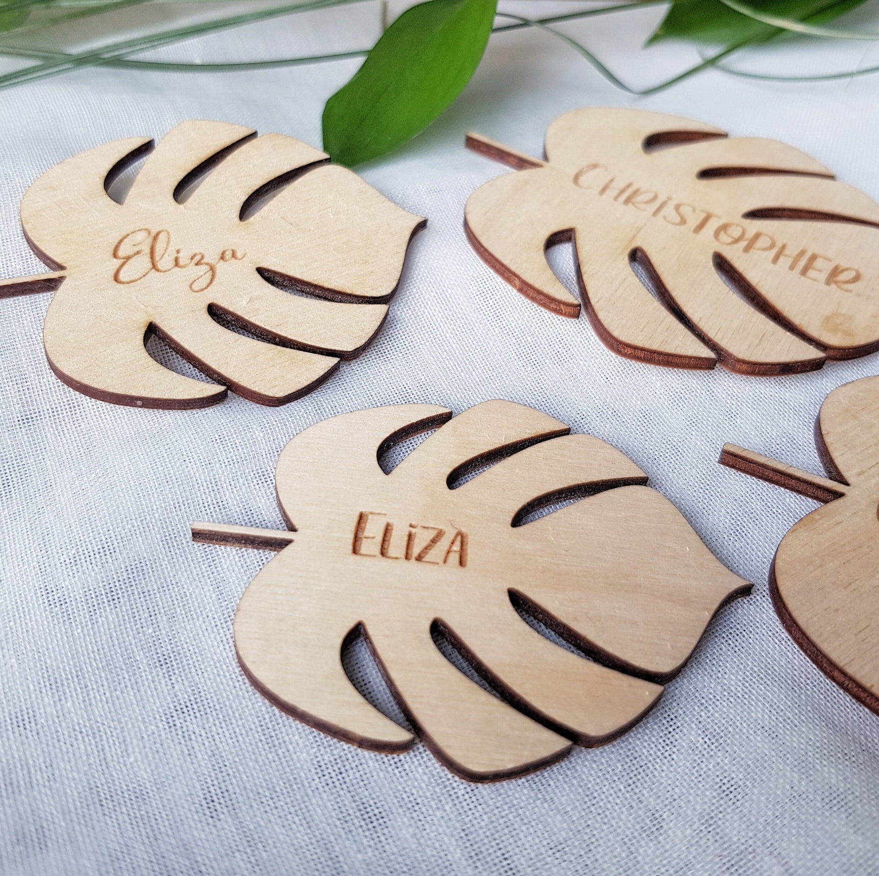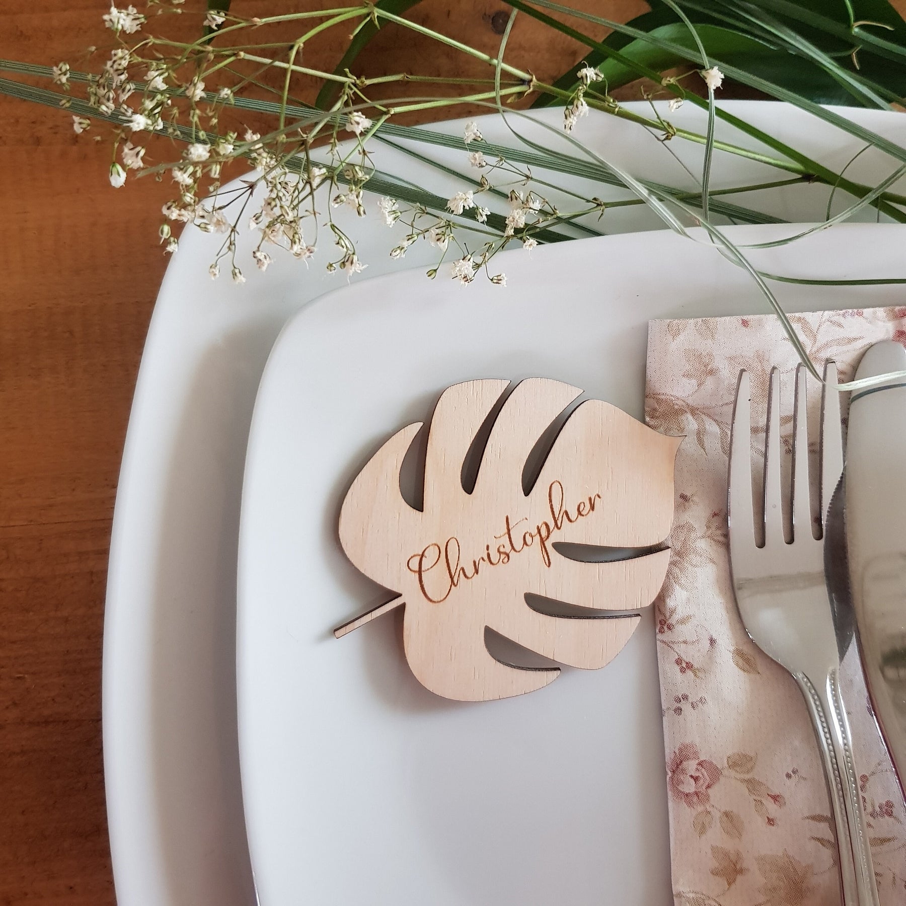 Wooden Monstera Leaf Place Name Setting are the perfect personalized touch to elevate your table decorations for weddings, Thanksgiving feasts, birthday parties, anniversaries, and any special gathering with family and friends. Crafted with care, each wooden name place is beautifully engraved with your chosen name, adding an elegant and rustic charm to your event. These unique and customizable place settings not only add a lovely visual element to your table but also serve as meaningful keepsakes for your guests to cherish. Make every occasion memorable with our Wooden Monstera Leaf Place Name Setting.
