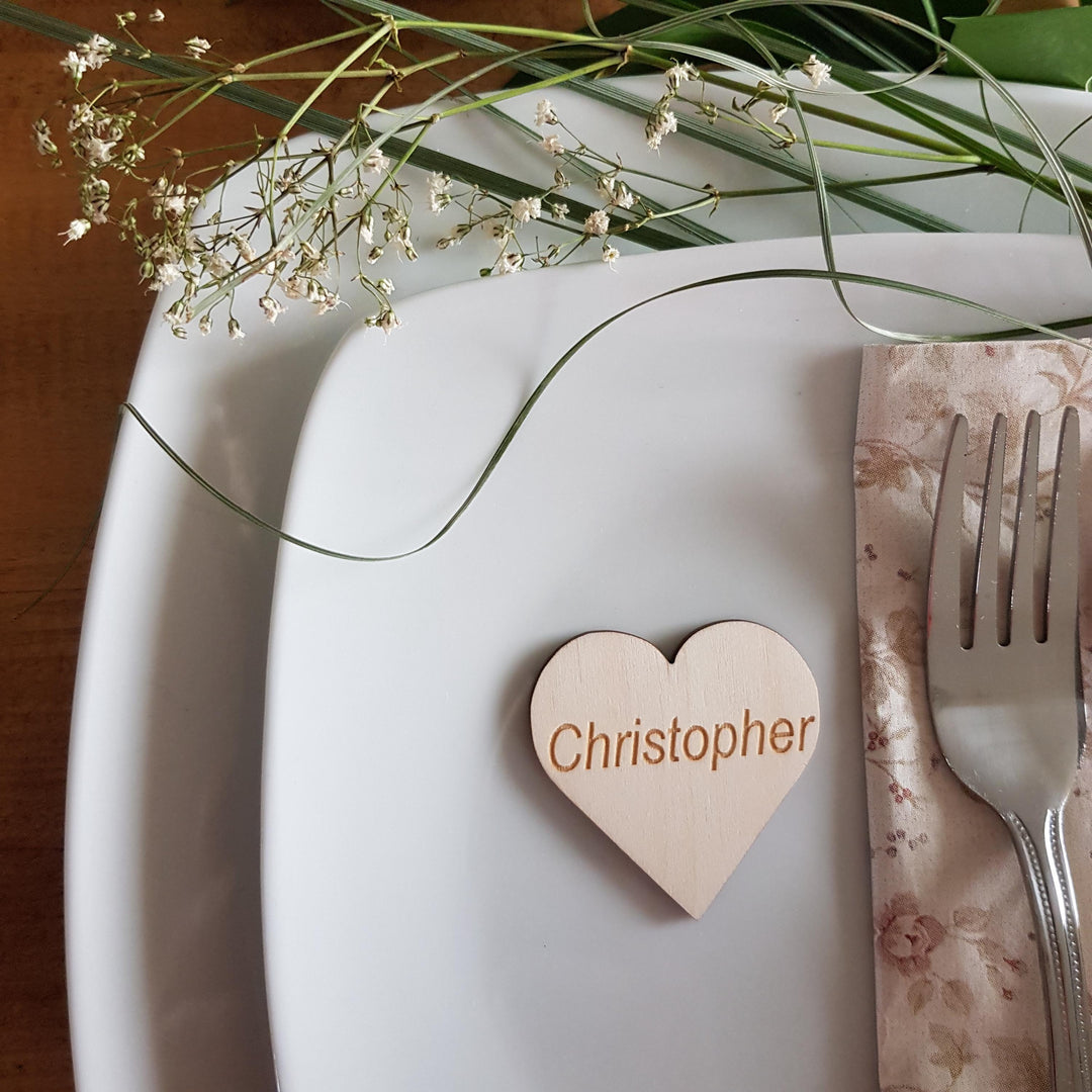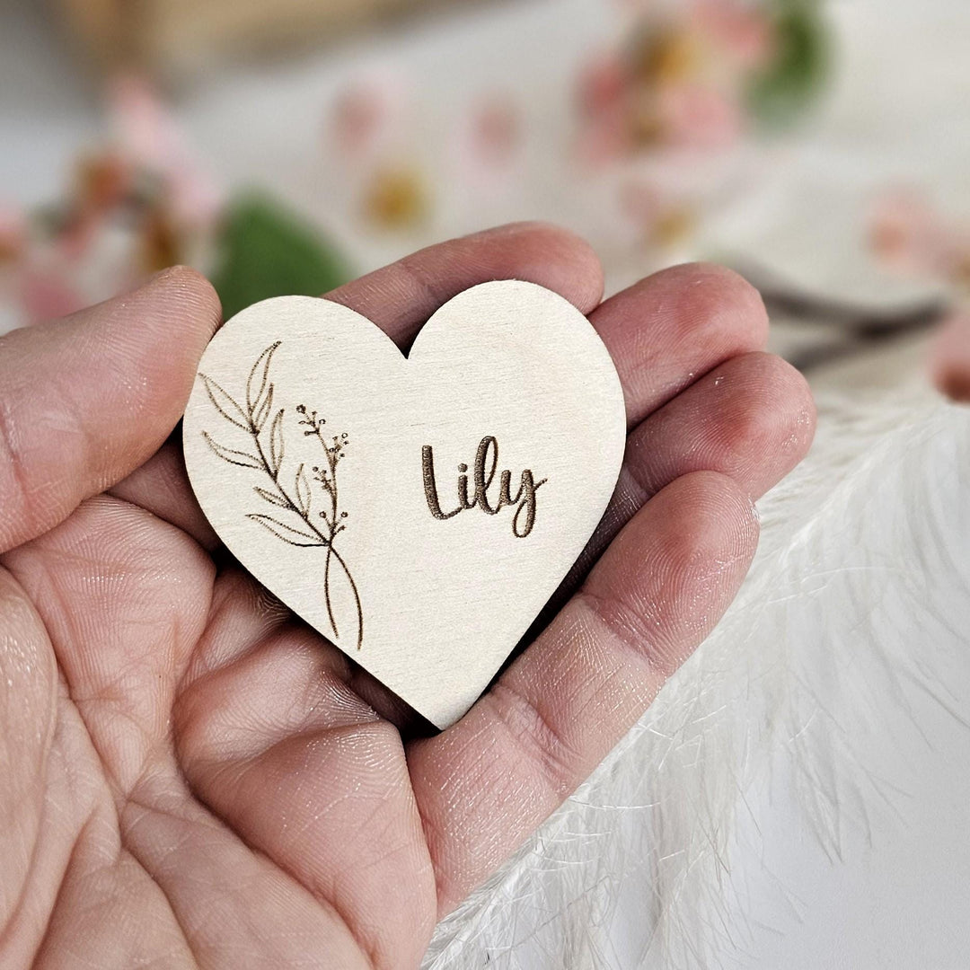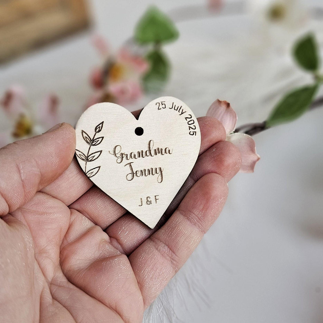 Wedding Place Name Favours, Personalised Engraved Rustic Heart Tags, Botanical Wooden Wedding Keepsakes