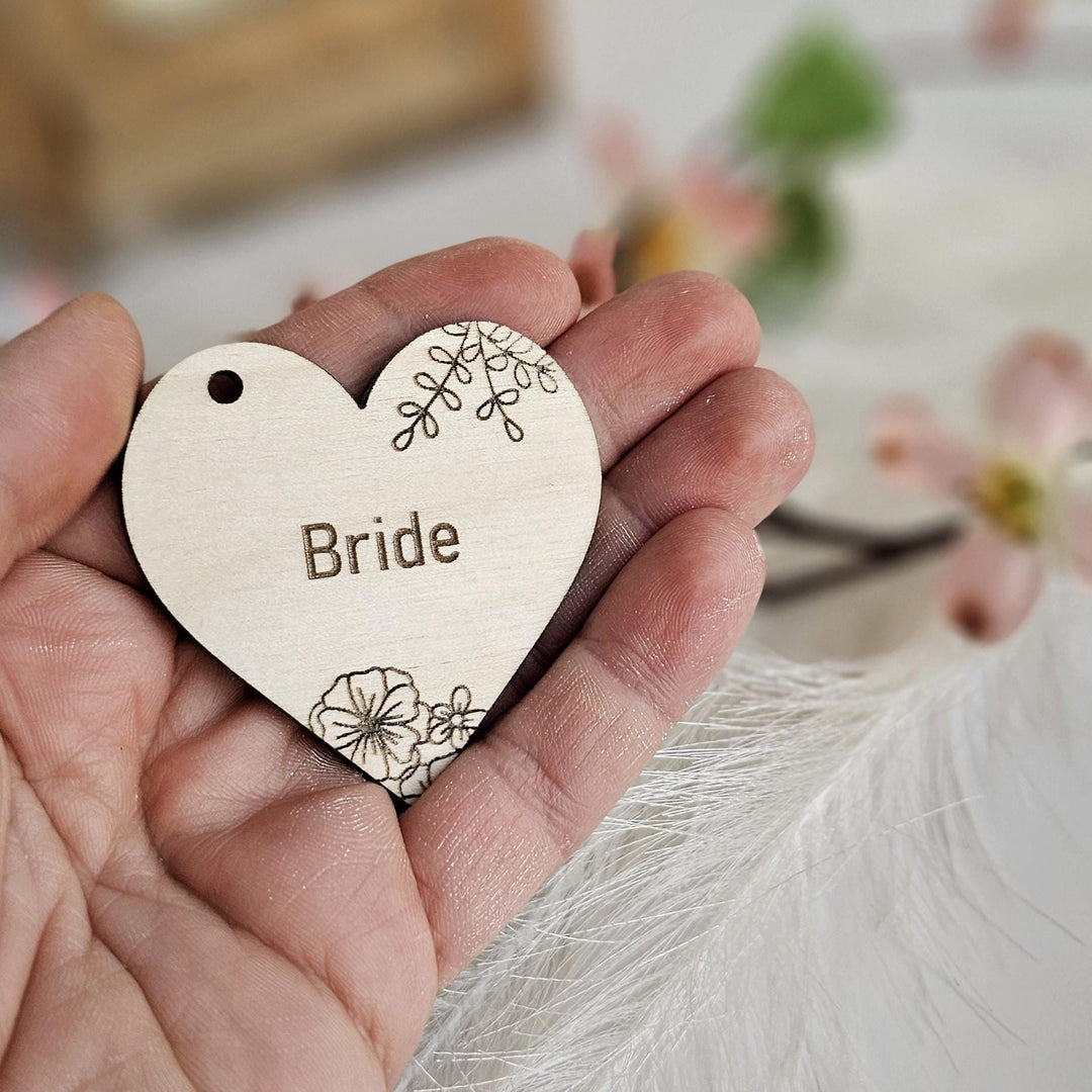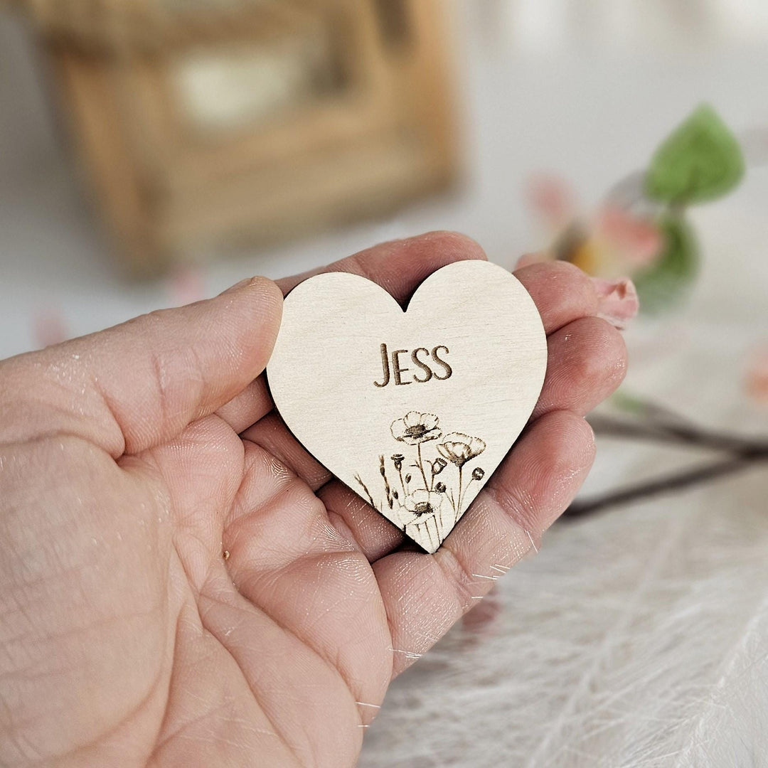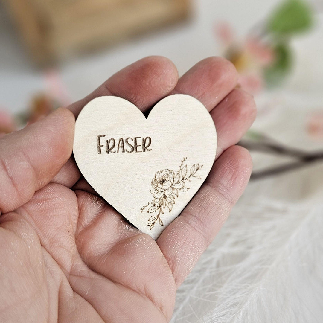 Wedding Place Name Favours, Personalised Engraved Rustic Heart Tags, Botanical Wooden Wedding Keepsakes